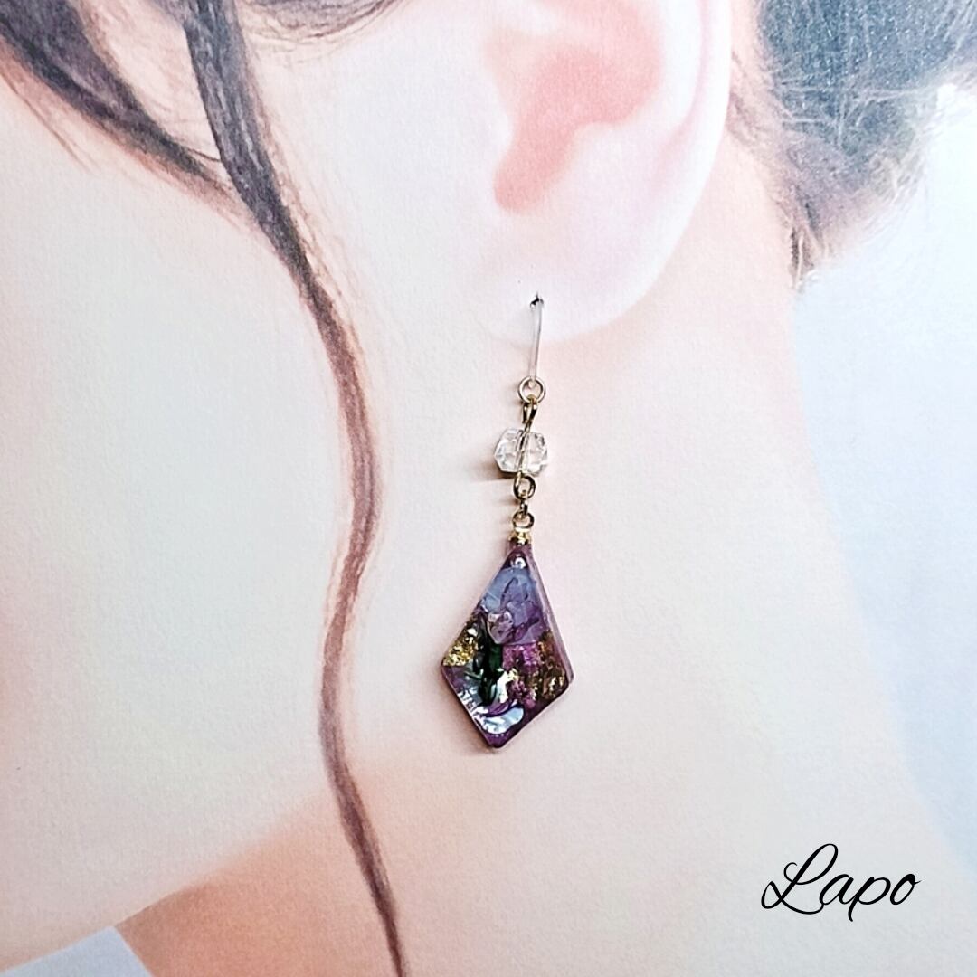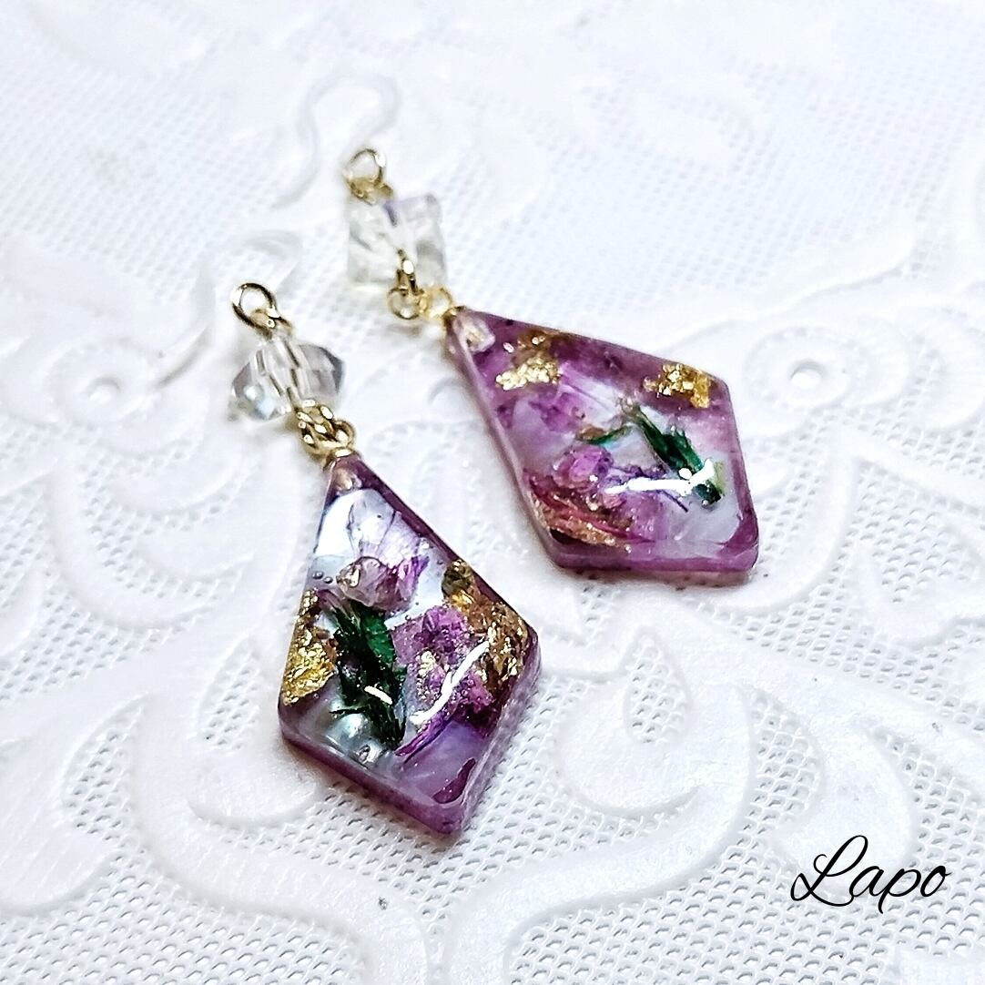 ひし形ドライフラワーピアス(パープル)【マテリアルシリーズ】